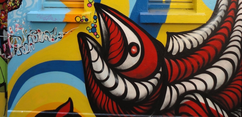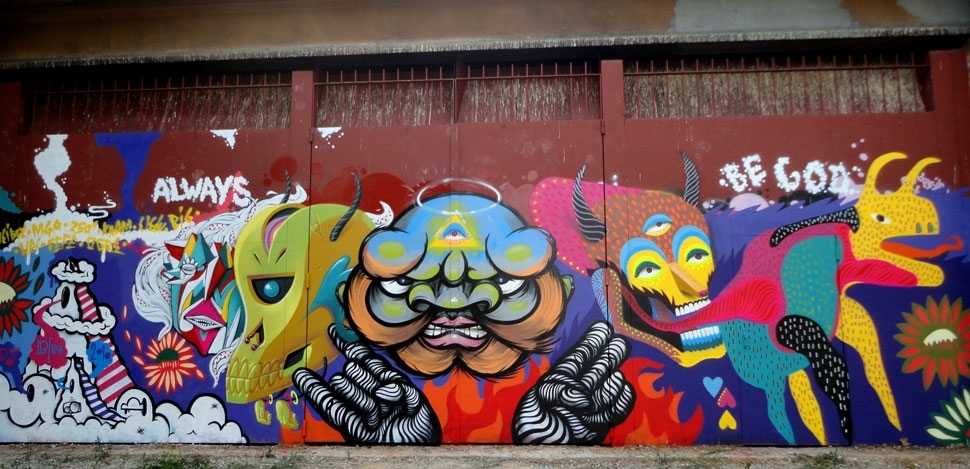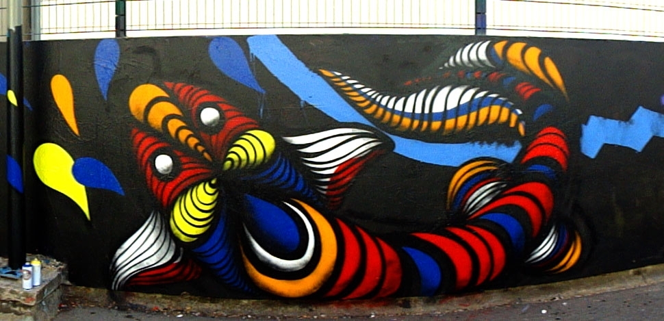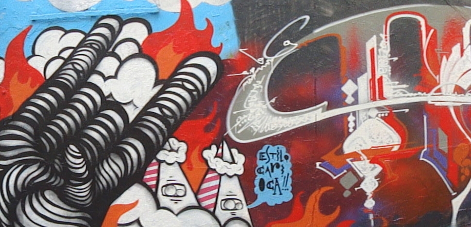 Graffiti em Hall of Fame na Cercania de Horta, arredores de Barcelona com Meibol (BCN), 2501 (ITA), Kran (BCN), Eledu (BCN), Big, Uriginal (BCN), Fefê Talavera e Ogre (FR) (2010).